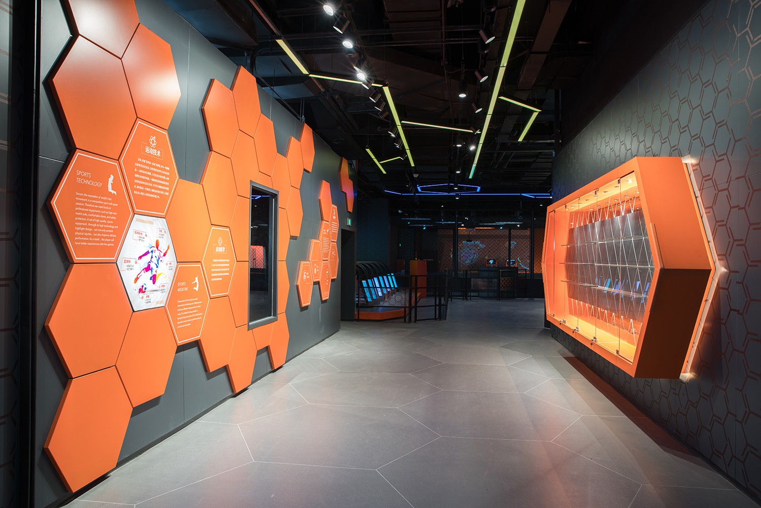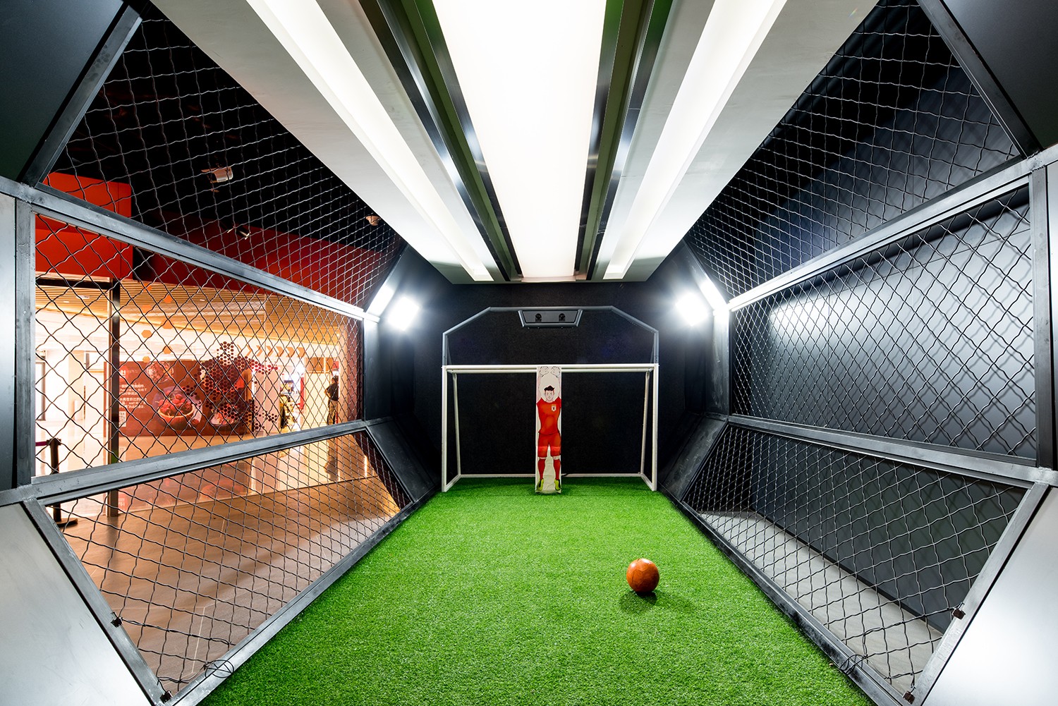 為保證小將館運營效益,蘇州金螳螂文化發展股份有限公司在保證足球主題及空間語言的前提下,調研分析場館定位受眾,結合中國市場特性,對小將館所有展項進行創新、提升,打造出一個不僅可以在虛擬、互動中體驗滑雪、田徑、騎行、乒乓球、攀巖等多項目,并且能以全新視野和超炫酷的娛樂方式與親朋好友約戰的高科技運動館。