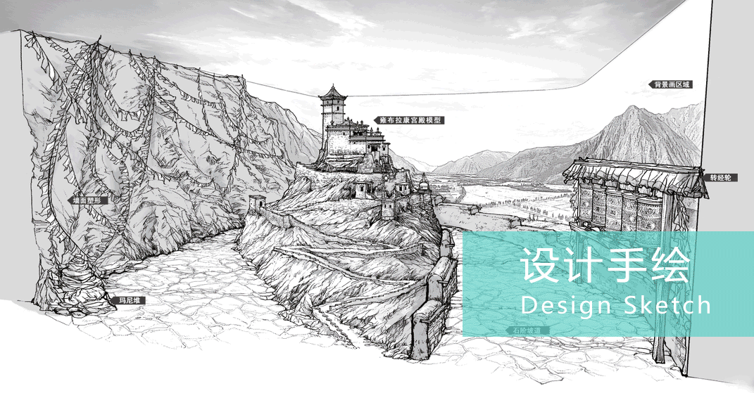 為了贏得文化共鳴,設計師將西藏歷史上第一座宮殿“雍布拉康”,整體引入空間。四面全景畫,局部投影高原藍天白云,結合影音,參觀者猶如已駐足青藏山巔,眺望遠處, “第一座村莊”、“第一塊田地”盡收眼底。整體空間凝練,以磅礴氣勢迎領開篇。