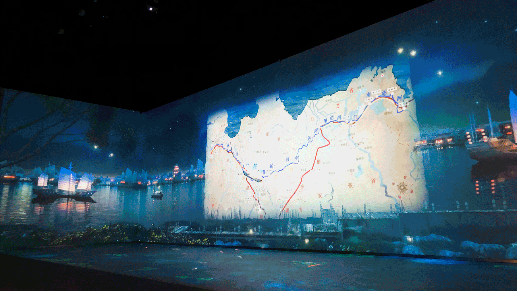 博物館一樓的青少年體驗中心由金螳螂文化傾力打造,墻壁與地面全影還原邯鄲境內大運河、“李白游歷邯鄲”、“白居易除夕做客邯鄲驛”等歷史場景,使孩子們可以穿梭于光影之中,領略邯鄲歷史故事,寓教于樂且增添了展覽的趣味性、體驗感。