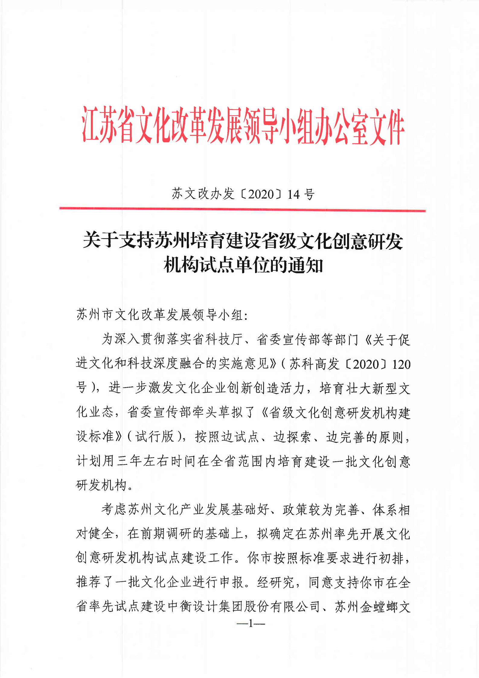 中共江蘇省委宣傳部、江蘇省科學(xué)技術(shù)廳、中共江蘇省委網(wǎng)絡(luò)安全和信息化委員會(huì)辦公室、江蘇省文化和旅游廳、江蘇省廣播電視局聯(lián)合發(fā)布了“關(guān)于認(rèn)定2020年度江蘇省重點(diǎn)文化科技企業(yè)的通知”,金螳螂文化公司榜上有名 。