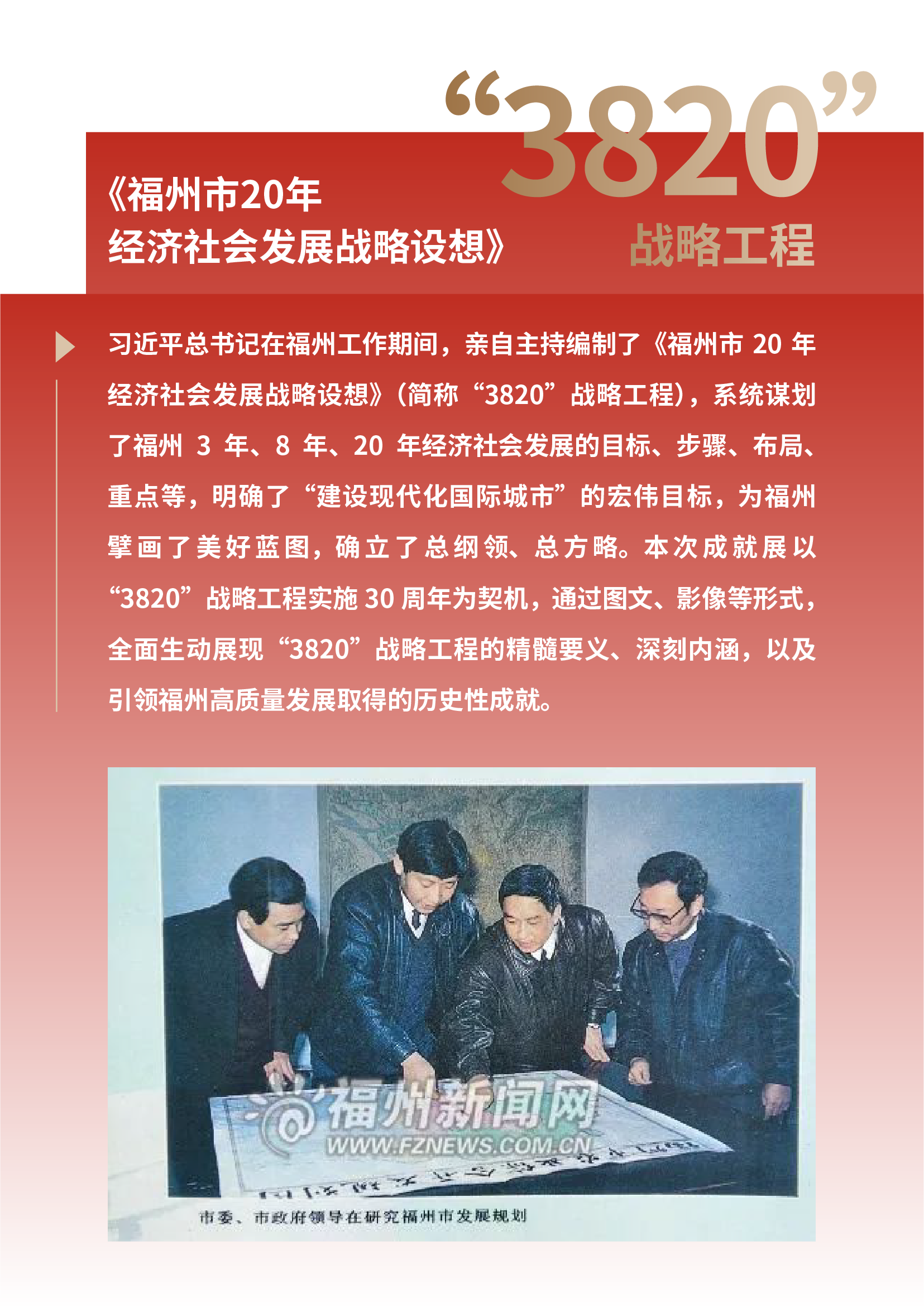 展覽聚焦經濟、政治、文化、社會、生態文明和黨的領導等六大領域35個主題,全方位、多角度展現“3820”戰略工程實施30年來福州的發展歷程和輝煌成就,充分反映“3820”戰略工程的科學性、前瞻性、系統性。