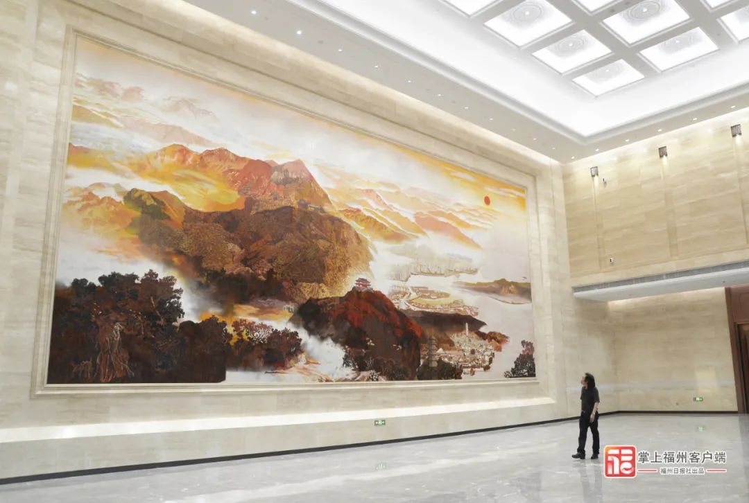 拾級而上,走進成就展的序廳,巨幅漆畫《閩山閩水物華新》氣勢恢宏,描繪了福州海濱城市、山水城市的風貌,一輪紅日噴薄而出、冉冉升起,榕城大地披滿霞光。畫面主要呈現了福州“三山兩塔一條江”,和榕樹、茉莉花、福橘等特色元素,展現福州邁向現代化國際城市的美好愿景,深情表達了習近平總書記詩詞的生動意境。