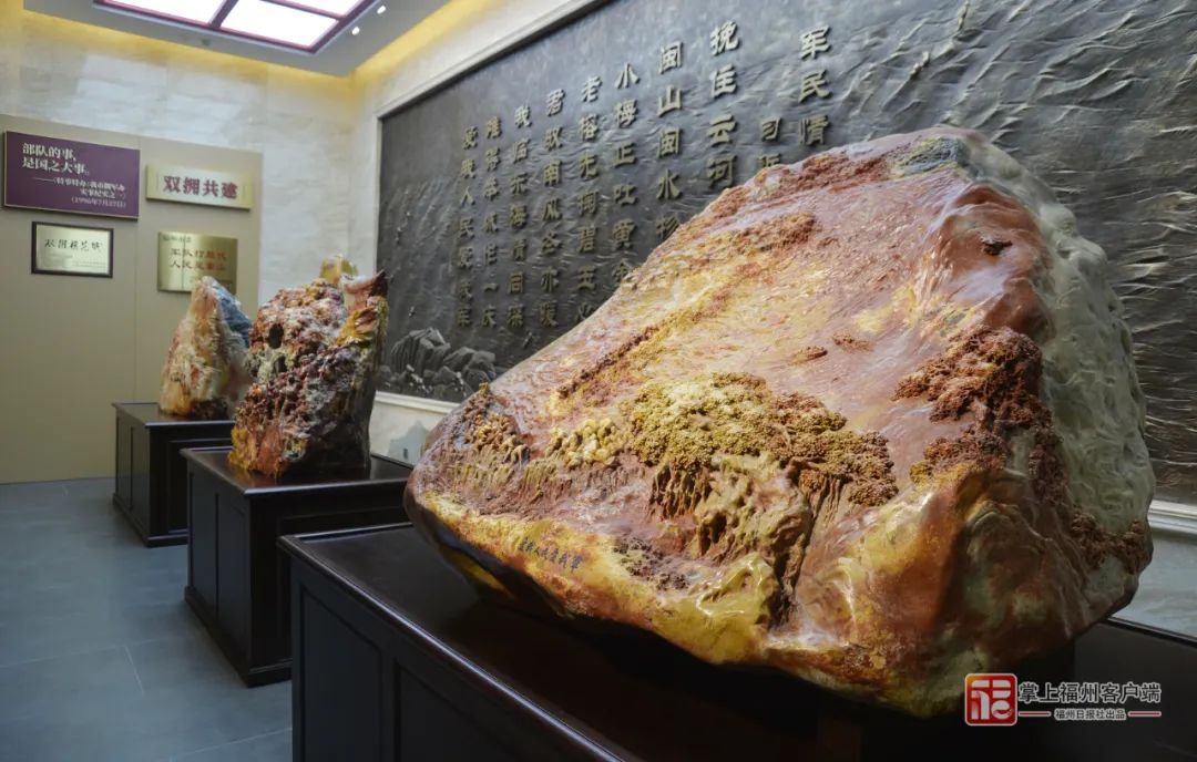 壽山石組雕《愛我人民愛我軍》位于“雙擁共建”展區,由《共建雙擁模范城》《人民軍隊人民愛》《愛我人民愛我軍》三件壽山石作品構成,共雕刻100多位人物,形象百態、生動逼真,俏色運用恰到好處,形成了渾然天成的藝術效果。習近平總書記在福州工作期間軍愛民民擁軍、軍民魚水情深的感人場景歷歷在目、直抵人心。