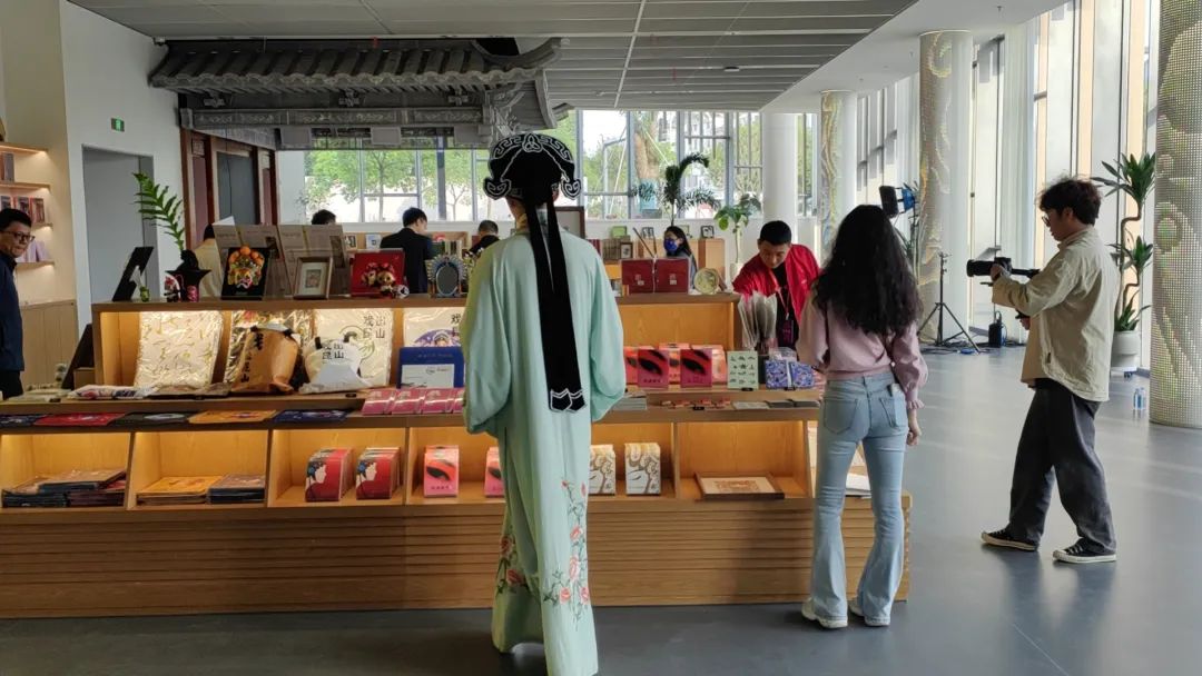 進入戲曲百戲博物館正門,向右拐便進入百花書局的展廳。偌大的展廳內,無處不在的戲曲臉譜、琳瑯滿目的文創產品、中西交雜的經典唱片、造型別致的沉浸式戲臺……