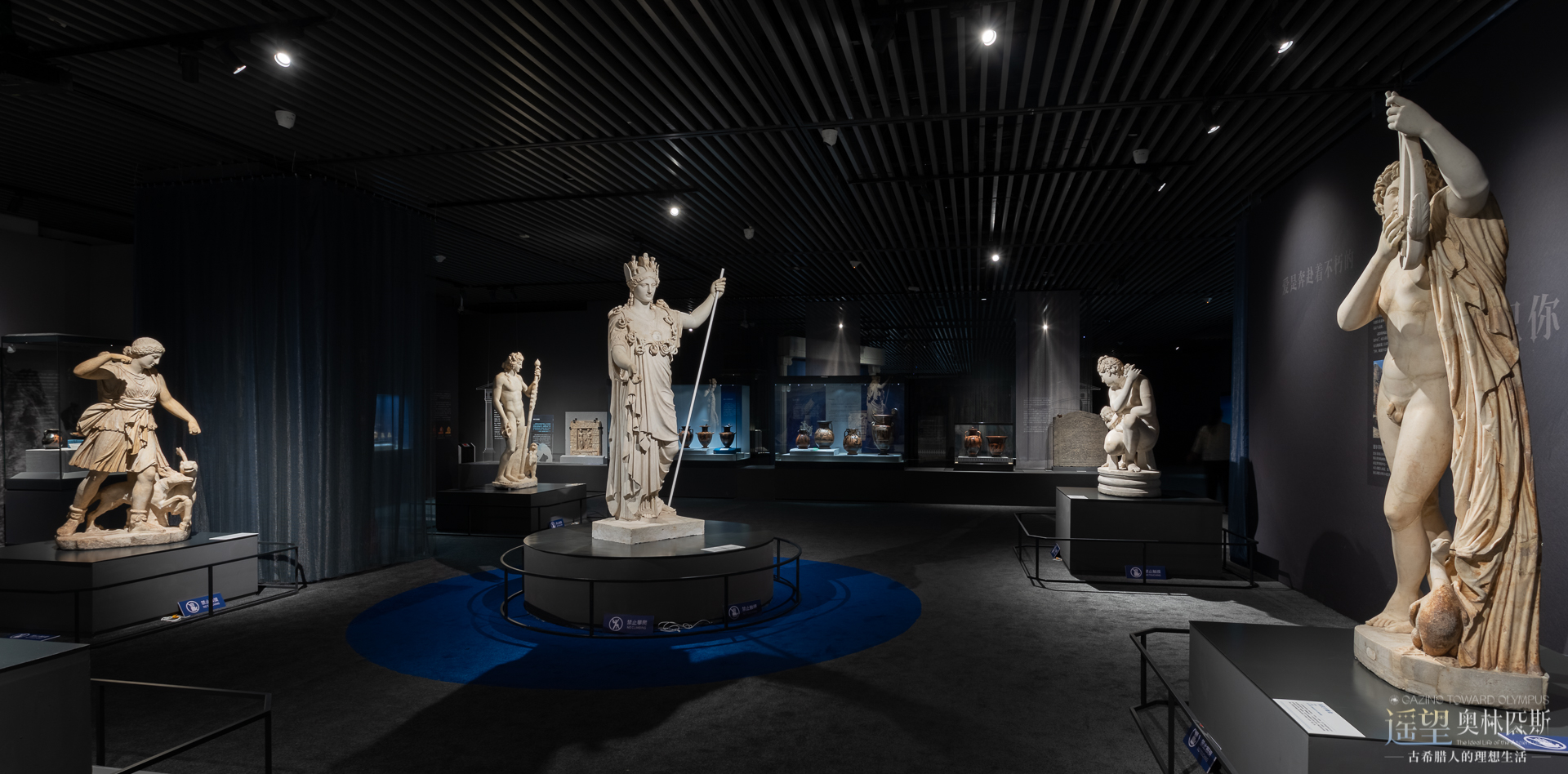 本次展覽的主題色使用地中海藍,使觀眾感受到愛琴海的浪漫與夢幻,展廳內采用深色墻面,與眾神雕像形成強烈的視覺對比,結合燈光的設計,營造了神秘而莊重的觀展氛圍。